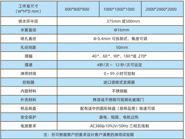 本用于考核電子電工產品,外殼和密封件在淋雨環境下能否保證設備和元件良好性能的試驗。本產品模擬滴水,濺水等各種環境。主要適用于通訊產品、汽車零部件、戶外照明及信號裝置等產品做防水性能測試及IP防水等級測試;同時檢測產品在運輸過程或使用中可能受到侵水的影響,為產品技術標準提供可靠依據;整個試驗過程在箱體內完成,水不會濺到室外,并且水可以循環利用。
